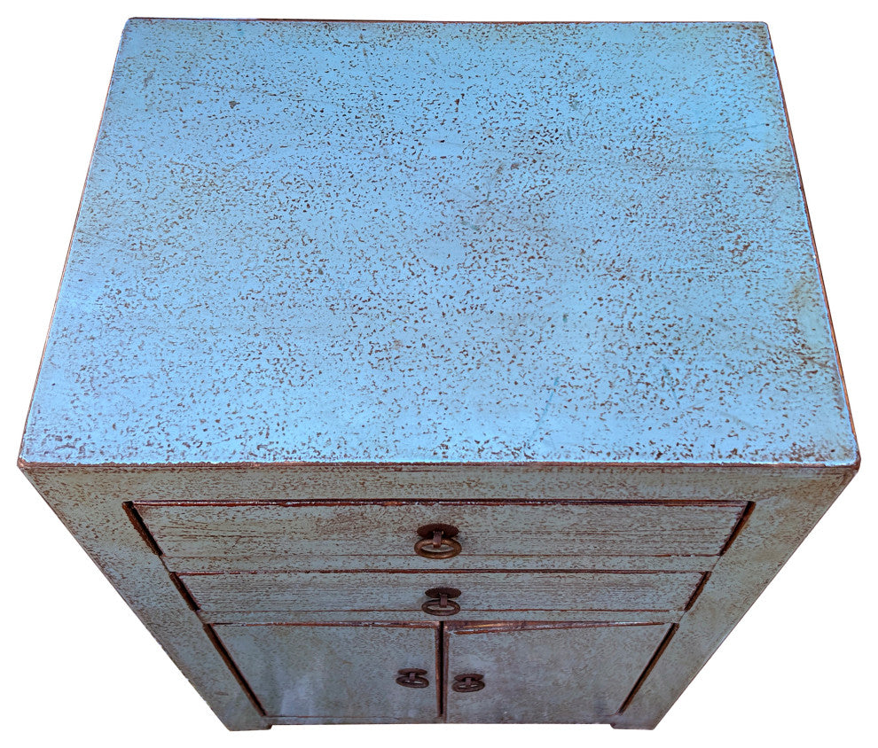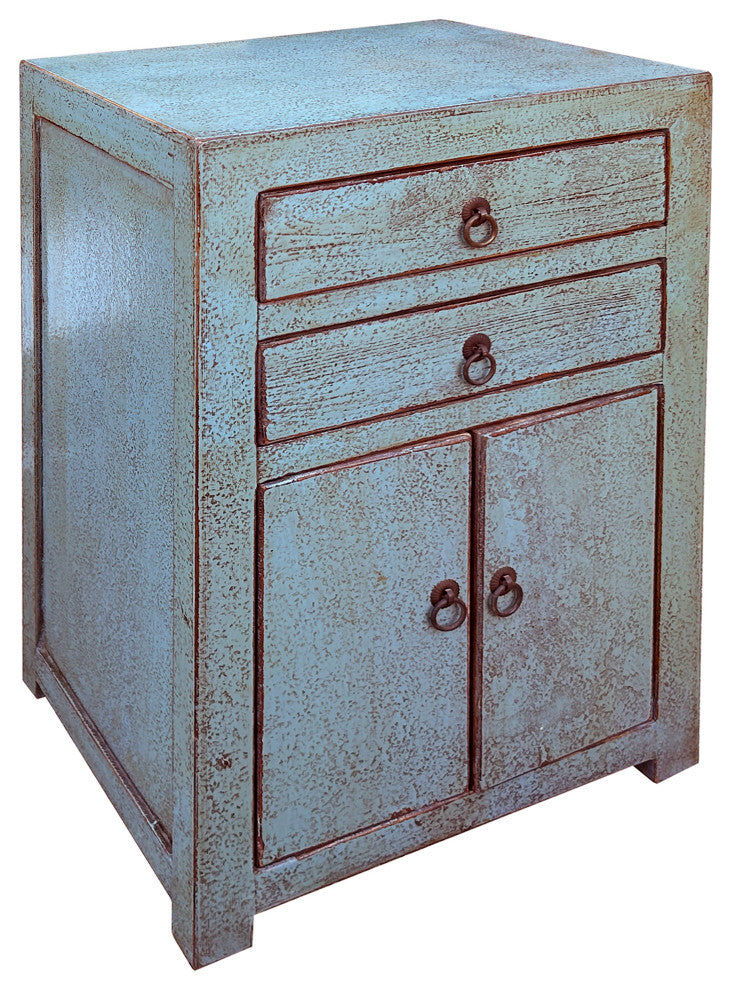 This is a charming, vintage-style cabinet with a rustic, distressed finish. The cabinet features a subtle fade gray blue paint that has been intentionally weathered, revealing hints of the underlying wood grain and giving it a well-worn, antique appearance. It has a compact, rectangular design with clean lines and a sturdy frame. The upper section includes two drawers, each adorned with a single round, metallic pull, perfect for smaller storage needs. Below the drawers, there is a cabinet with double doors, also equipped with matching round pulls, providing ample space for larger items. The overall aesthetic is reminiscent of traditional craftsmanship, making this piece a beautiful addition to a bohemian, farmhouse, or eclectic interior decor. Its distressed finish and unique color make it a standout accent piece that adds character and warmth to any room.Dimensions: w16" x d12"x h23.5"Origin: ChinaMaterial: Elm WoodCondition: hand made, minor color off, vintage style finish, distressed marksWork: no assembly required, ship in one pieceUSA domestic continental buyers of 48 states pay $135 shipping (buyers of Hawaii, Alaska, US Islands, Florida Keywest, and Canada pays the extra shipping cost). Insurance and handling charges are already included in the shipping cost. In store pick up is highly welcomed if you are in San Francisco Bay Area. (No charge)