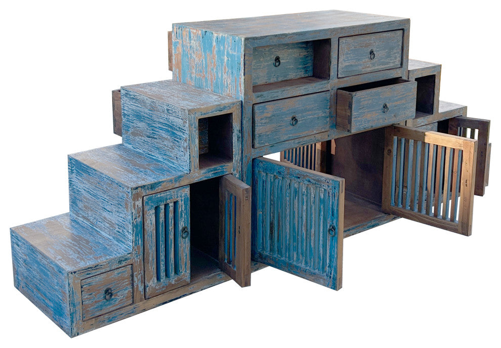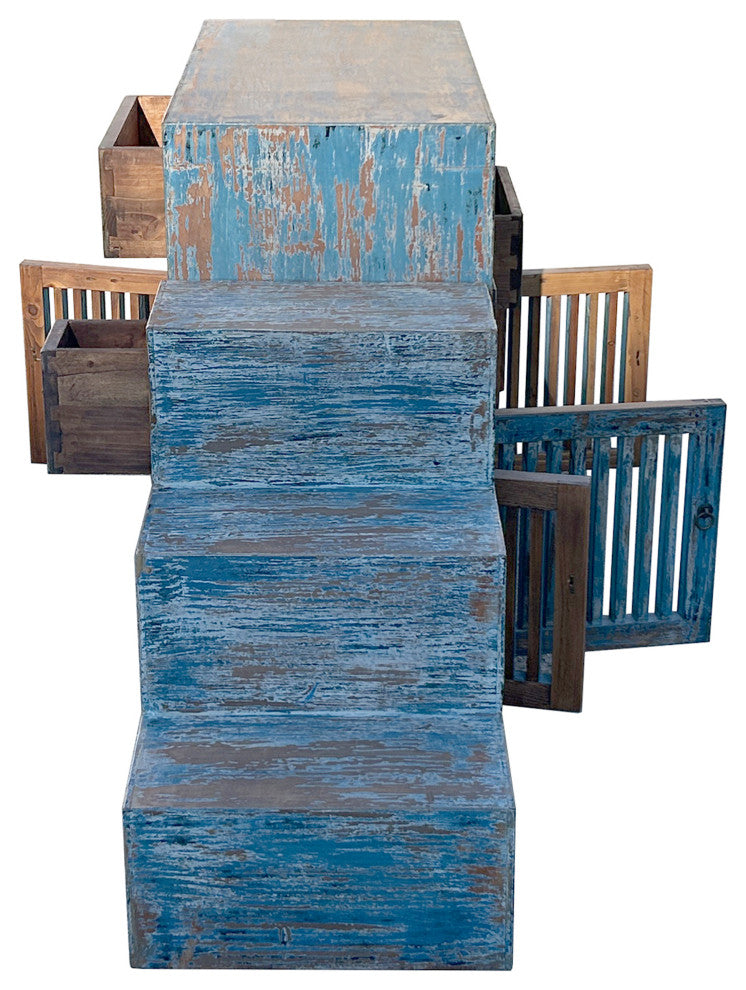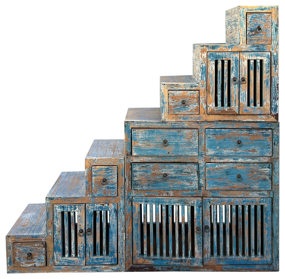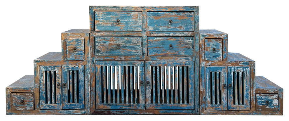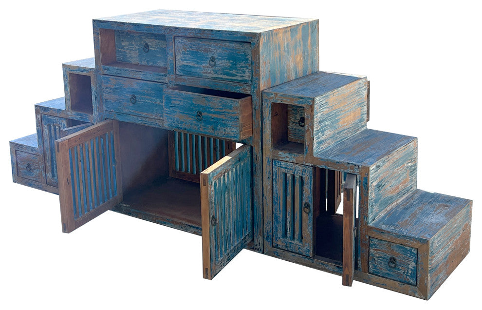 Distressed Teal Blue Triangle Step Tansu Cabinet Display Room Divider Hws4389