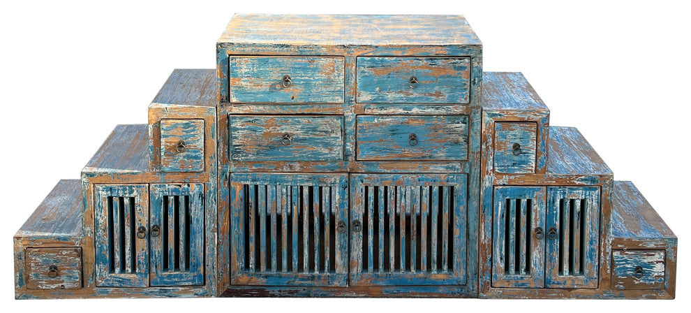 This unique and eye-catching Chinese antique tiered triangle step shape storage cabinet is a testament to traditional craftsmanship. Crafted from wood with a beautiful distressed teal blue finish, this piece features multiple drawers and doors, offering ample storage space for a variety of items. The tiered design creates a visually interesting display, while the antique patina adds a touch of history and character. This versatile cabinet can be used as a functional storage solution or as a decorative accent piece in any room, adding a touch of Chinese artistry and cultural richness to your home.Dimensions: w54" x d15.5" x h54" ( triangle height 23" )Origin: ChinaMaterial: Elm WoodCondition: hand-made, distressed marks, original chip marks . Work: Ship in 3 piecesUS domestic continental buyer of 48 states pays $480 shipping charge for curbside delivery. Customer from New York, Hawaii, Alaska, US Island, Florida Keywest, and Canada pays extra shipping cost. Insurance and handling charges are already included in the shipping cost. In-store pick-up is highly welcomed if you are in San Francisco Bay Area. (No charge) White-Glove (4-8 weeks transit) service can be arranged with additional cost - needs quotation based on the destination.When your shipment is delivered, carefully inspect the outside of the packaging before the delivery personnel leave. It is important to clearly indicate if there is any visible damage to the packaging or items on the delivery paperwork. Carriers usually do not honor concealed damage claims so it is crucial to clearly indicate any visible damage to the packaging or items on the delivery paperwork.