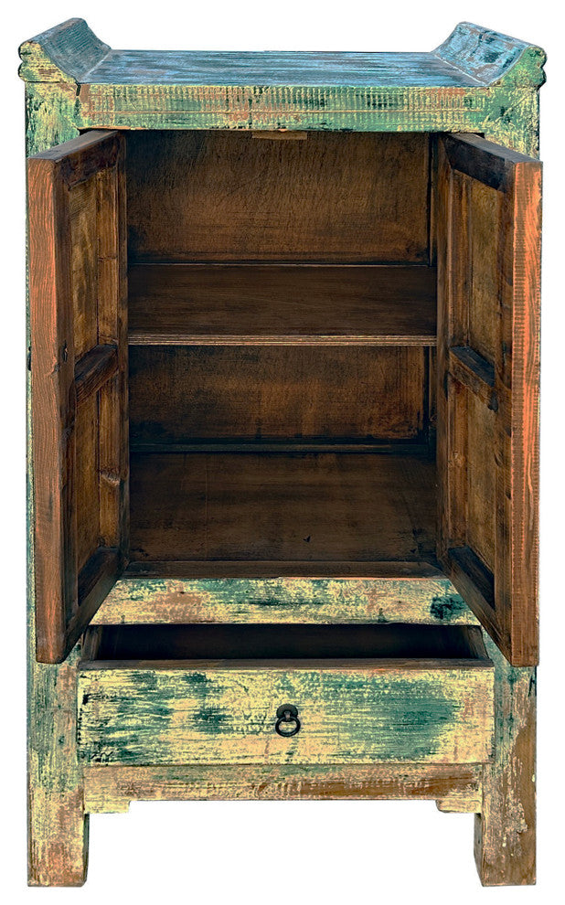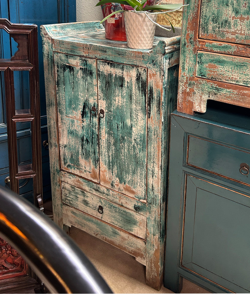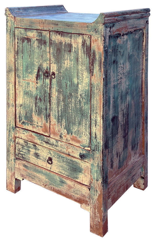 This rustic green cabinet embodies a weathered, timeworn charm with its heavily distressed finish and traditional design. Crafted from solid wood, the cabinet features two upper doors with simple metal knobs, their surfaces revealing layers of faded teal green paint mixed with exposed natural wood and hints of reddish-brown undertones. Below the doors, a single drawer with a matching knob adds additional storage, while the sturdy, slightly tapered legs provide a stable base. The textured, chipped surface tells a story of age and use, making this piece a perfect addition to a rustic or vintage-inspired interior, where its unique patina can shine as a focal point.Dimensions: w22.5" x d16.75" x h42.5" / 40.75", inside w20"x d13"x h24"Origin: ChinaMaterial: Elm woodCondition: Wood imperfection marks, wood gap, rust on metal, wear-out marksWork: Handmade, shipped in one pieceUS domestic continental buyer of 48 states pays $380 shipping charge for curbside delivery. Customer from Hawaii, Alaska, US Island, Florida Keywest, and Canada pays extra shipping costs. Insurance and handling charges are already included in the shipping cost. In-store pick-up is highly welcomed if you are in San Francisco Bay Area. (No charge) White-Glove service can be arranged with an additional cost.For customers who are looking to buy multiple items. We can either combine "œseveral items on the same pallet "œor "œinclude small items inside the largest item as long as it fits in"�When your shipment is delivered, carefully inspect the outside of the packaging before the delivery personnel leave. It is important to clearly indicate if there is any visible damage to the packaging or items on the delivery paperwork. Carriers usually do not honor concealed damage claims so it is crucial to clearly indicate any visible damage to the packaging or items on the delivery paperwork.