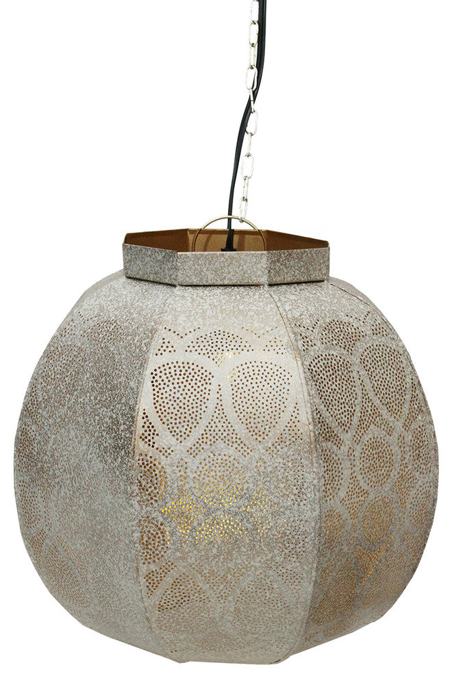 Distressed White and Gold Moroccan Cut-Out Hanging Lantern Pendant
