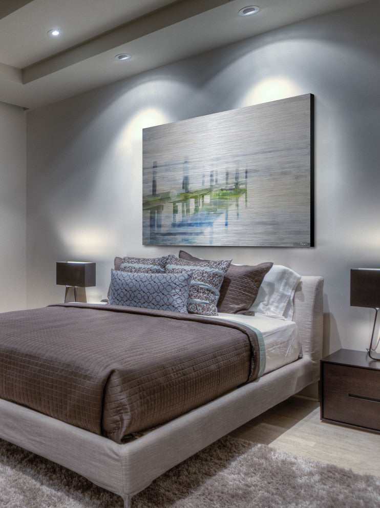 Striking and unique, the "Dock Mist" UV Ink Print on Brushed Aluminum by Parvez Taj will bring your walls to life. Printed on aluminum, this 36 inch wide by 24 inch tall contemporary artwork will make a statement in any living room, dining room, or bedroom.- Fine art UV ink print on brushed aluminum by Parvez Taj- The aluminum pops the colors and creates an iridescent shimmer, which gives depth to a room- Arrives ready to hang - Includes a certificate of authenticity- Artist signature on the front