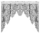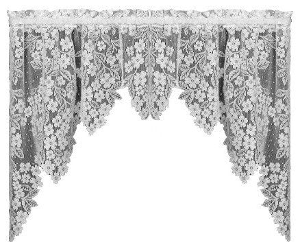 These intricately-detailed window dressings have a lovely all-over motif of stylized dogwood blossoms against a sheer lace background. Machine wash. Made in the U.S.A. 100% polyester. Machine wash cold, gentle. Do not bleach. Lay flat or hang to dry. Touch up with cool iron if desired. 1" Header 1.5" Rod pocket For wider windows use the Valance between Swag Pair halves Fine-gauge lace