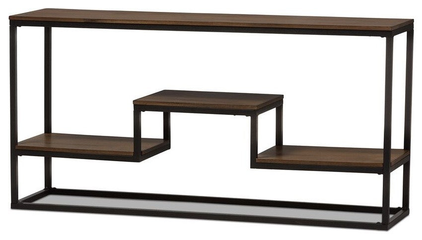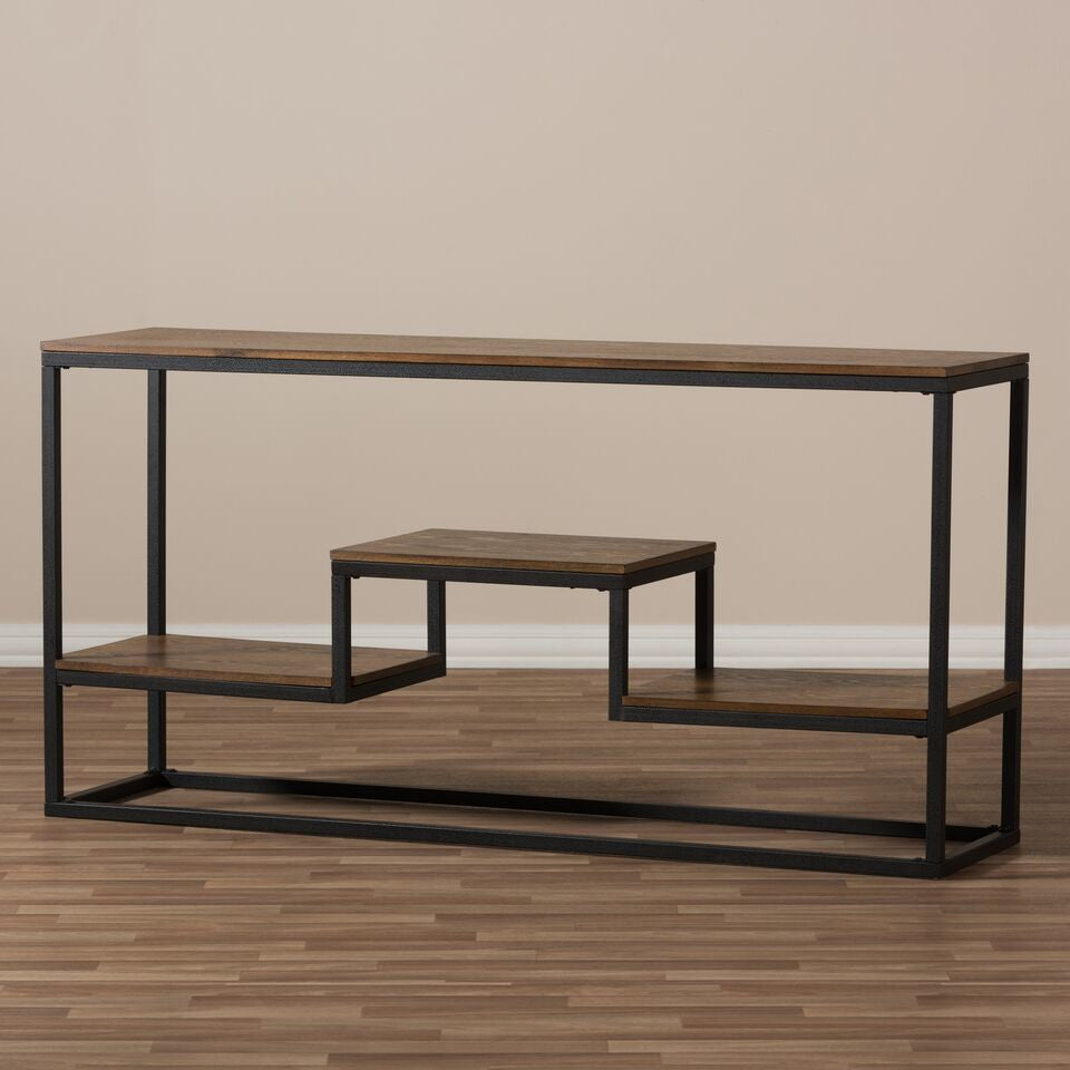Featuring weathered oak in an aged and rustic charm, the Doreen''s Industrial look and angular shelf makes it a console with character. Constructed of tubular metal and finished in black textured finished, the Doreen will add some rustic charm to your home. Mixing distressed wood and metal, this aesthetic is both edgy and stylish. Featuring three fixed shelves, the Doreen is perfect for entryway to hold everyday belongings and cut the clutter in your home. Made in China, the Doreen console table requires assembly.