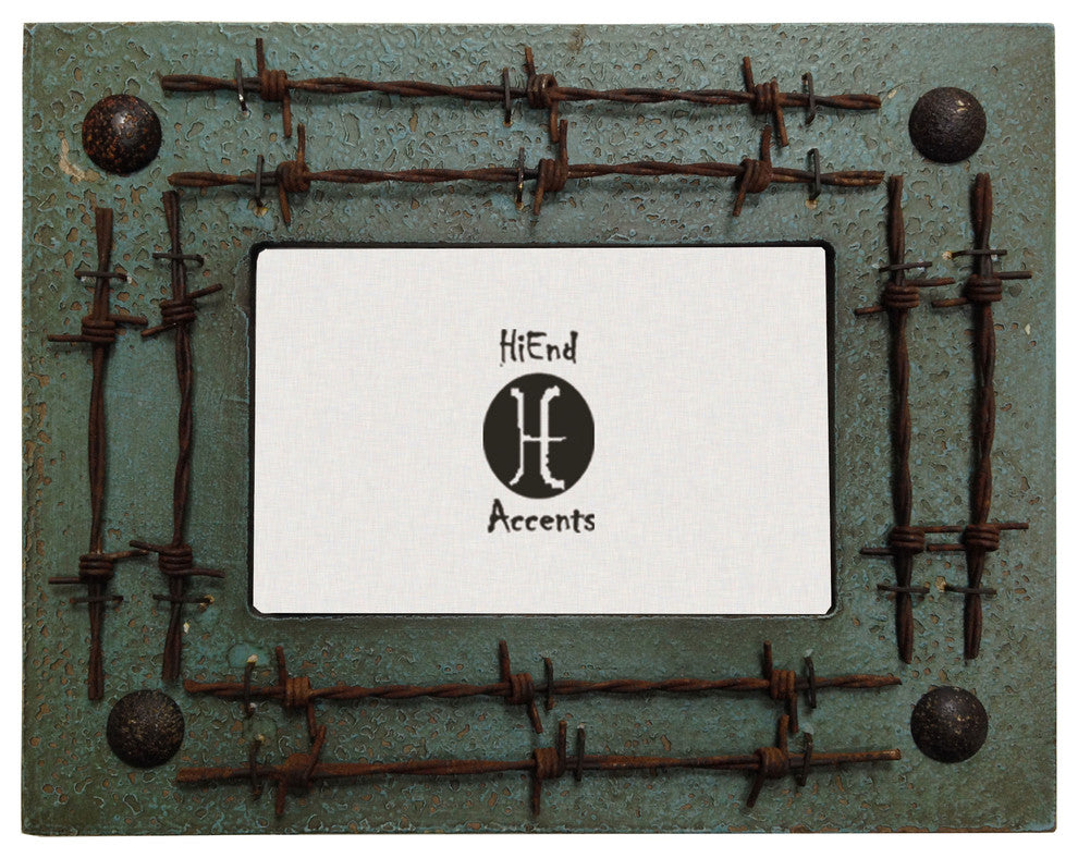Distressed wood, turquoise finish with a barbwire applique. This 4x6 photo frame will add a touch of western to your decor. The HiEnd Accents Home D_cor Collection provides all of the little details that bring the style of a home together. Each piece is designed to be tasteful and inspiring, while maintaining quality and affordability.