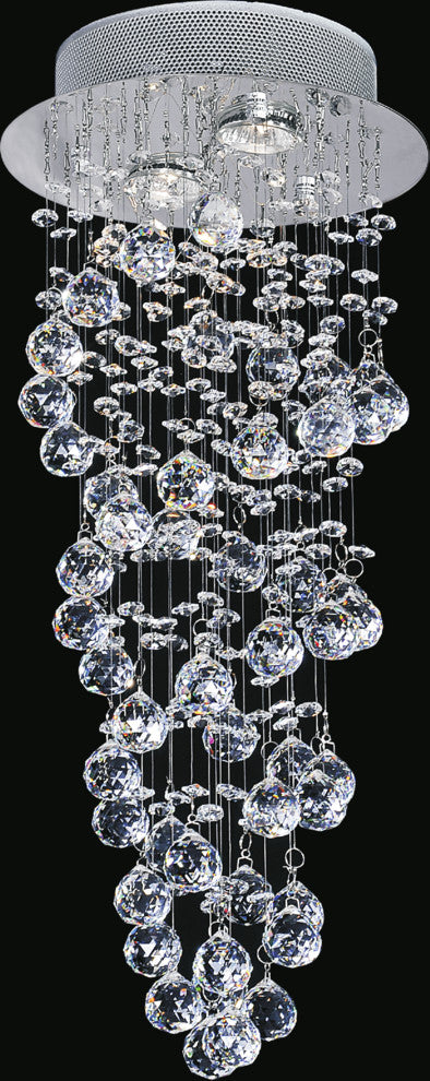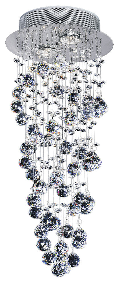 Delivering high sparkle minus the large footprint, the Double Spiral 2 Light Flush Mount is the perfect choice to update your limited space with a touch of luxury. This light source features a 10 inch round canopy in chrome with two hanging spiral stands of crystal beads. A barely-there curtain of smaller crystals finishes the look with subtle style. Whether turned on or off, this glittering light fixture will provide your space the style boost it needs. Feel confident with your purchase and rest assured. This fixture comes with a one year warranty against manufacturers defects to give you peace of mind that your product will be in perfect condition.