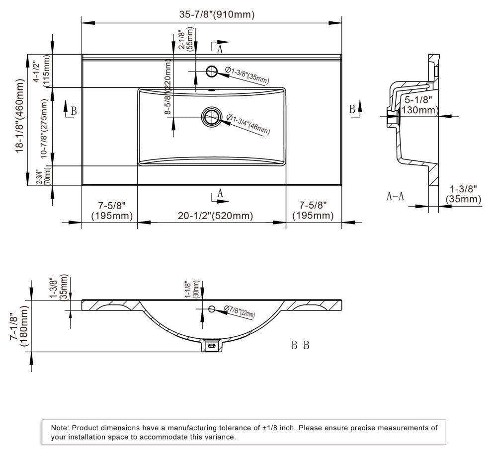 Ceramic topmount bathroom vanity basin with one sink and one faucet hole. 18" front-to-back depth fits on top of a vanity cabinet of the appropriate size. Available in white in widths of 24", 30", 36" and 48" with bowl depth options of 6.25" and 7.125"