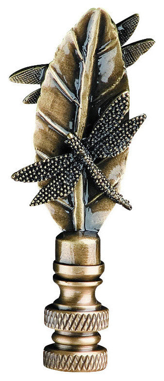 A new lamp finial is the perfect way to complete your new or favorite lamp. Quality finial that is sure to dress up your tired lamp. Finials have a standard 1/4"-27 thread, which will fit the harp on almost every lamp. (This means the opening is 1/4" wide and there are 27 threads per inch.) 95% of all lamp harps will fit this finial. Finial measures 3" height and 2.25" width. Material: Antiqued Metal finish with Antiqued Metal Base.Dragonfly on Leaf SHAPE - 2.25" width Dragonfly on Leaf lamp finial. A perfect Dragonfly on Leaf to top off your table or floor lamp.Antiqued Metal FINISH - Antiqued Metal finish will match most lamp harps.PERFECT SIZE - Proportional sized to fit most standard table or floor lamps. Finial measures 3" height and 2.25" width. Threaded at 1/4" wide opening, threaded for standard 27 threads per inch.FUNCTIONAL - Secures your lampshade to standard table or floor lamp.EASY TO USE - Easily screws on/off. Fits standard lamp harps that measure 1/4" wide with 27 threads per inch.