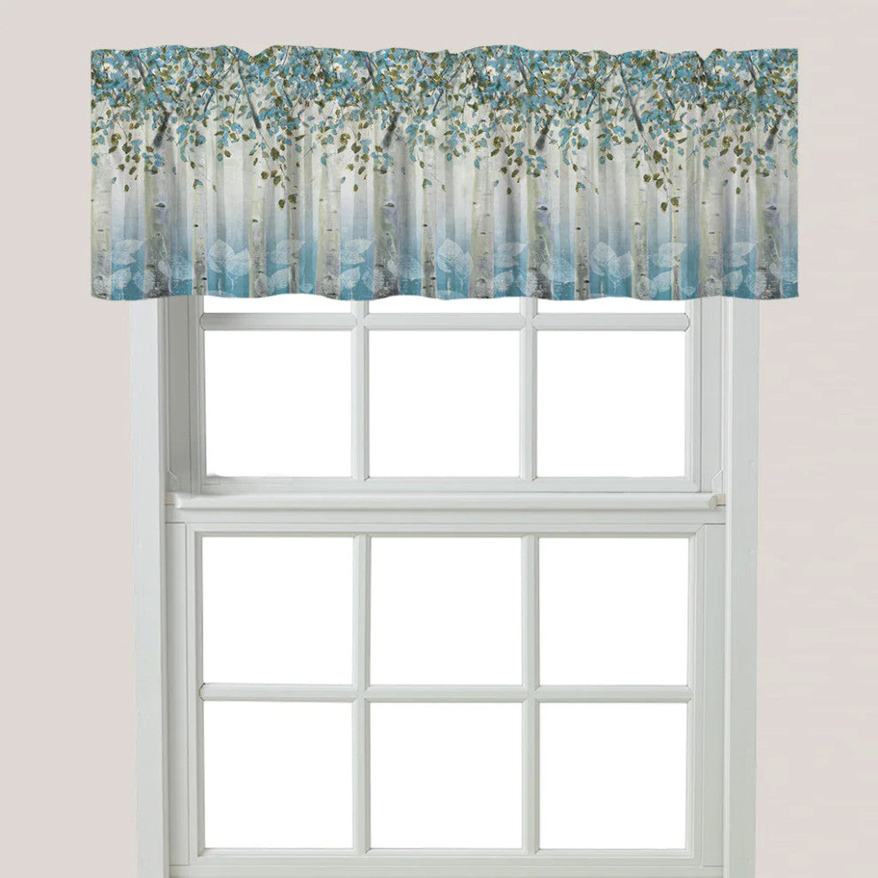 This nature inspired window valance, "Dream Forest," features beautiful birch trees. Blue and gold hand painted leaves are clustered on top against a soft blue and off white background. "Dream Forest" will surely create a serene look in any home.