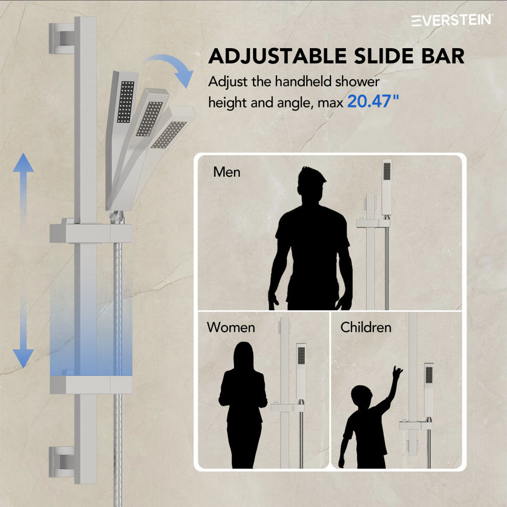 Elevate your shower experience with the EVERSTEIN Shower Faucet System. Featuring a 22" wall-mounted rainfall and waterfall showerhead, it offers a relaxing dual-function experience. The 59" handheld shower with an adjustable slide bar provides unmatched flexibility. Certified by cUPC, it includes a brass pressure-balancing valve to prevent scalding, offering safety and convienence. Features:Important Purchase Note: only for new and remodeled bathrooms, installation requires removal of tile/existing fixtures and repiping, please consult a plumber before purchasing.Dual-function showerhead: Enjoy a spa-like experience at home with the 22" wall-mounted showerhead, offering both rainfall and waterfall options.Pressure-Balanced Valve: It can effectively prevent scalding due to sudden fluctuations in hot or cold water temperatures. The valve features two built-in check valves to eliminate water hammer noise.Versatile Handheld Design: Includes a 59" hose and a 26" adjustable slide bar, offering personalized shower height and angle adjustments for a convenient and comfortable experience.Quality Promise: All-metal construction with a solid brass mixing valve for durability. 304 Stainless Steel Rain Shower Head features silicone nozzles for easy cleaning.Install with Confidence: Our products are cUPC, CEC, and Massachusetts Plumbing Products Approval (248 CMR 10.00) certified.Meets the highest standards of safety and durability.Adjustable Water Flow Rates: Comes with a water-saving disc offering flow rate options of 2.5 GPM for full shower enjoyment or 1.8 GPM for water conservation.Material:22" Shower Heads & Arm: Stainless SteelShower Panel: Stainless SteelMixer Valve: BrassHandheld Shower & Hose: Stainless SteelSlider Bar: Stainless SteelAfter-Sales Warranty: EVERSTEIN provide a lifetime warranty that covers all issues not resulting from human error or accidental damage, providing long-term support and peace of mind. If you encounter any problems, our team is here to assist you.