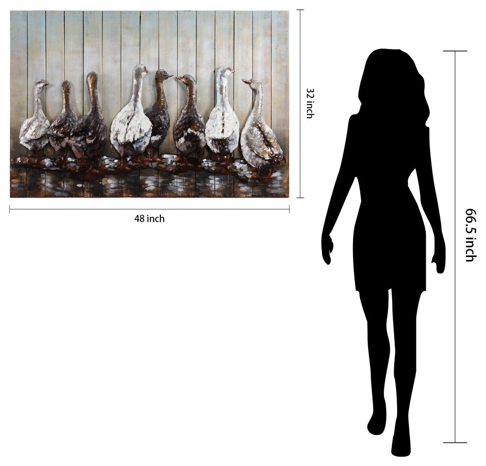 Artist Primo is proud to present his three-dimensional iron wall sculptures on slatted solid wood. This collection represents the culmination of Primo''s dream to take his original artwork and make them available to all that love his concepts in. This 32" x 48" unique original is hand painted and a signed work of art that''s renown for Primo''s skills of manipulating iron into a textured work of art with extraordinary depth and skill. For this piece, Primo depicts a landscape of a group of ducks�quack, quack! This industrial style of mixed media can also be presented outdoors as long as it is varnished every year, as it will take on a patina characteristic that is inherent in its presentation.