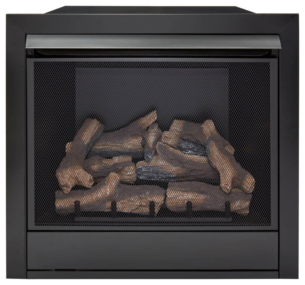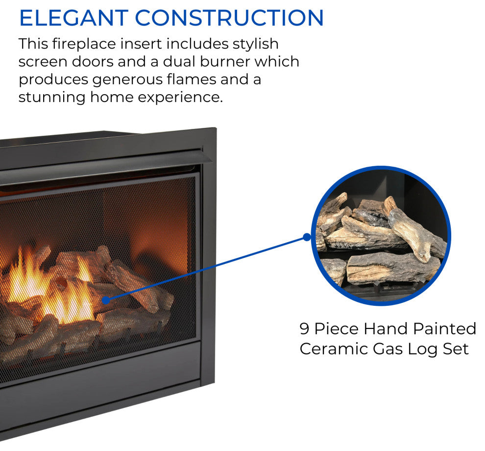 This Duluth Forge Full Size 32 Inch Vent Free Zero Clearance Fireplace Insert allows you to build a custom fireplace for your home. The insert is zero clearance approved so it can be framed without adding air gaps or spacing on the sides and top of the unit. You can pair it with a face mantel or recess it directly into a wall of your home. The stylish arched fireplace screen and dual burner which produces generous flames along with a realistic sprayed brick liner creates a stunning home experience. Remote Control comes standard with Appliance. This fireplace insert includes many features like remote control functions, Oxygen Depletion Sensor with automatic shut-off, battery assisted piezo ignition, and much more. Using Natural Gas or Liquid Propane, the Duluth Forge Ventless Fireplace Inserts radiates 32,000 BTU of heat, enough to heat 1,500 square feet of living space.• 32,000 Maximum BTU using Natural Gas or Liquid Propane • Heats up to 1,500 sq. ft. • Patented Dual Fuel Technology • 1 Unit operates off Natural Gas or Liquid Propane • Remote Control Included • Remote Control Functions: On/Off, Temperature Control • 9 realistic hand painted Ceramic Fiber Logs • Vent free gas fireplace insert • Dual Precision Ported Vent Free gas burner • Economical: 99.9% efficient. No outside duct or chimney needed! • Safety Assurance: O.D.S. (Oxygen Depletion Sensor) included with automatic shut-off • Battery assisted Piezo ignition • Product Dimensions: 36.38"W X 33.27"H X 18.38"D • Product Weight: 88.2 lbs. • Gas Fireplace Model Number: FDI32RThis Product Is Proudly Assembled in the USA Using Parts Manufactured in the USA! • Designed, Engineered, Assembled and Tested in the USA. • Skilled American workers manufacture parts, assemble and test our products. • Only high-quality materials and parts are used in the manufacturing of our products. • Our factory features state of the art manufacturing equipment. • Product ships from our domestic warehouse in Kentucky, USA.Accessories • Blower Sold Separately - Model FIB100 What''s In the Box • Vent-Free Fireplace Insert - Qty. 1 • Hand Painted Ceramic Fiber Logs - Qty. 9 • Remote Control - Qty. 1 • Receiver - Qty. 1 • AAA Battery - Qty. 3 • AA Battery - Qty. 4