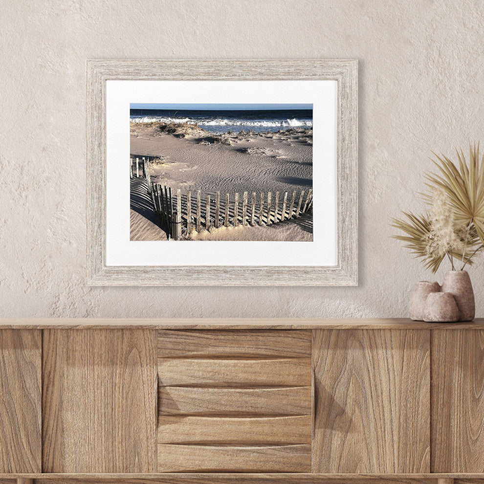 A solitary beach view highlights a beautiful ocean seascape. Matted in white and framed in a sloped profile distressed whitewash finish.