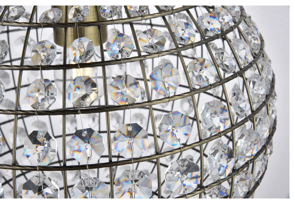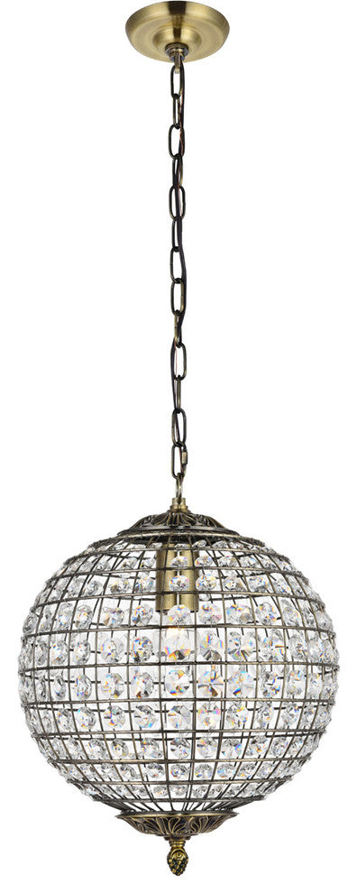 Brighten any room with this celestial globe of radiance, as overhead light bounces and dances off of dozens of octagonal Crystal prisms. The beautiful spherical pendants of the Earlene collection are shaped by latitudinal and longitudinal metal ribs supporting the multifaceted ornaments, capped above and below with bases featuring delicate folds of antique bronze and a distinctive lower finial. The 12-inch-diameter fixture is conveniently illuminated by a single bulb (not included).