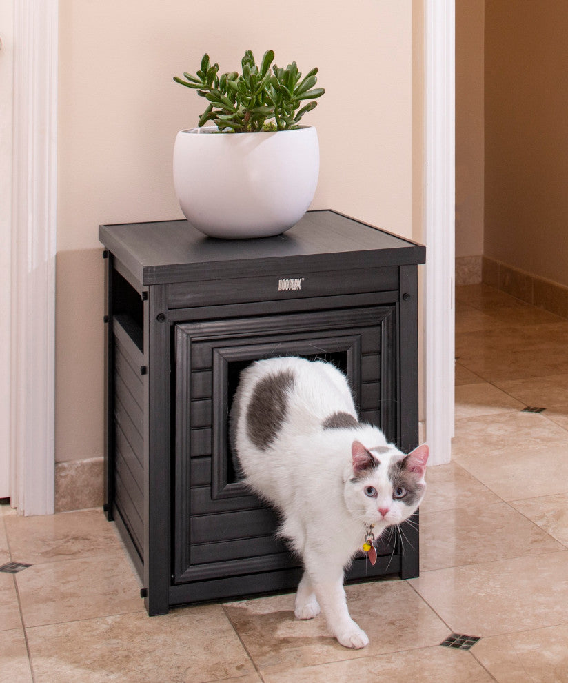 The New Age Pet Litter Loo® is made with ECOFLEX®, a proprietary composite blend of recycled polymers and reclaimed wood fiber by-products. The ECOFLEX® material is non-toxic, eco-friendly & impervious to moisture & odor, making it the perfect material for your pets"™ furniture. All New Age Pet furniture is backed by a 10-year limited manufacturer warranty. The LitterLoo® combines function and fashion, concealing the unsightly litter box while blending in with your homes decor. Available in two sizes, Standard and Jumbo and in four colors, espresso, russet, antique white and gray. New Age Pet® products are easy to assemble and easy to clean.