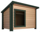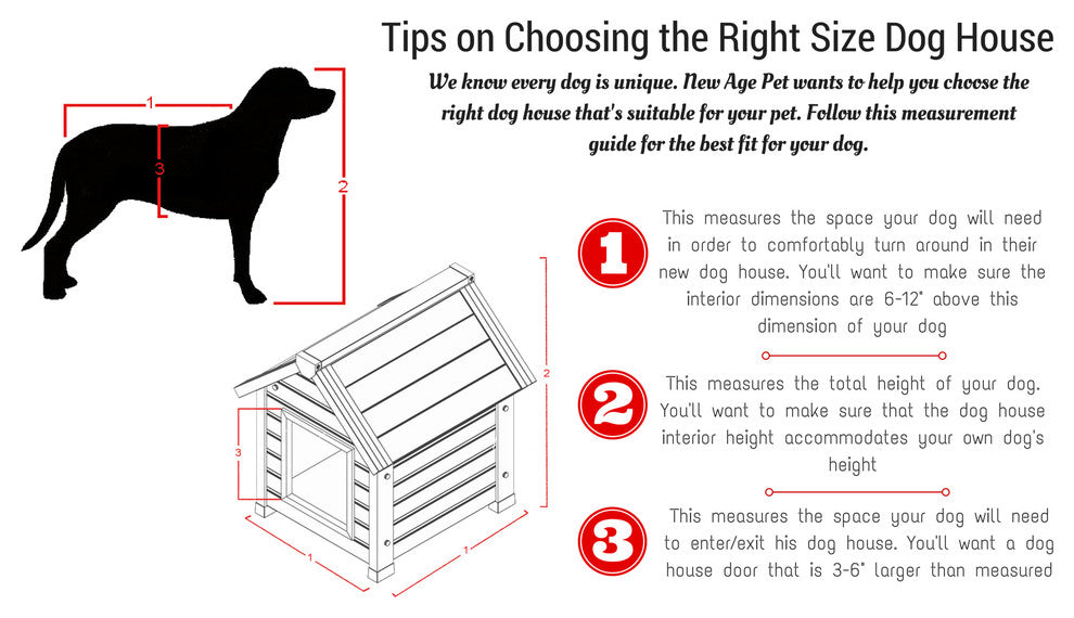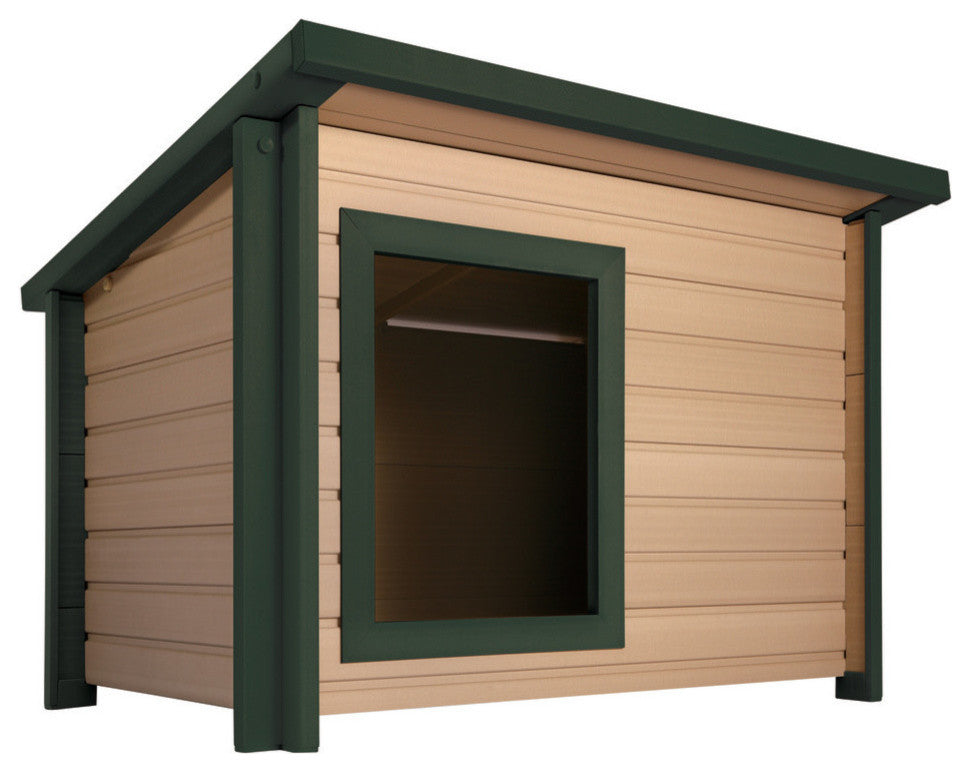 The New Age Pet Rustic Lodge Dog House is made with ECOFLEX®, a proprietary composite blend of recycled polymers and reclaimed wood fiber by-products. The ECOFLEX® material is non-toxic, eco-friendly & impervious to moisture & odor, making it the perfect material to keep your pet happy and healthy. All New Age Pet outdoor products are backed by an unrivaled 10-year limited manufacturer warranty. This dog house features a raised floor design for superior ventilation and a roof that removes easily for cleaning. Door flap available for separate purchase. Available in sizes: Medium, Extra Large and Jumbo. Color; Maple with Green trim. New Age Pet® products are easy to assemble, easy to clean & easy to LOVE!Accommodates most dogs up to:Medium-110 lbs.Extra Large- 120 lbs.Jumbo-130 lbs.Assembled dimensions:Medium 29.2"L x 36.2"W x 25.8"HExtra Large 32.5"L x 42.5"W x 29.5"HJumbo 39"L x 46.3"W x 37.4"HInner dimensions:Medium 31.3"L x 20.3"W x 22"HExtra Large 37.2"L x 23.3"W x 25.2"HJumbo 41.5"L x 29.6"W x 32.3"H