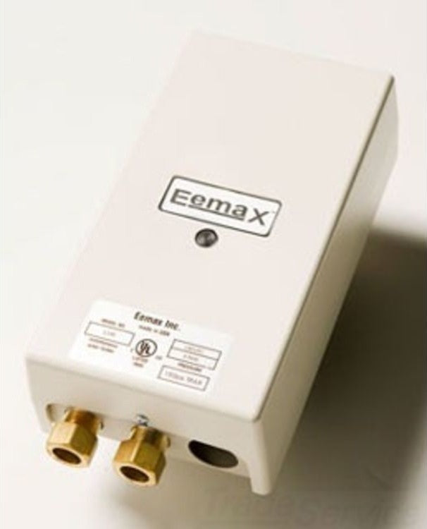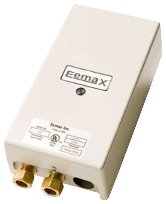 EEMax EX75 Electric Tankless Water Heater. Flow Controlled Single Point-Electric Tankless Water Heater Eemax offers a series of single point of use units that are perfectly suited for hand washing while cutting energy costs and saving space with its compact design. Additional features include; Complies with handicap requirements, on demand hot water, 99% Energy Efficient, and a limited 1-year warranty on parts, and 5-year warranty on leaks.Features:Voltage: 240VProudly made in USAPower: 7.5kWAmperage: 32ADimensions: 10.75" W x 5.25" H x 3" DTurn-on: .7 GPMTemperature rise at 1.0GPM-51deg FStainless Steel 5/8" I.D. Compression (1/2" copper pipe) at bottom of unitField Replaceable Stainless Steel ElementWeight: 4 lbs.