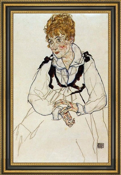 18" x 27" Egon Schiele Frau Schiele framed premium canvas print reproduced to meet museum quality standards. Our Museum quality canvas prints are produced using high-precision print technology for a more accurate reproduction printed on high quality canvas with fade-resistant, archival inks. Our progressive business model allows us to offer works of art to you at the best wholesale pricing, significantly less than art gallery prices, affordable to all. This artwork is hand stretched onto wooden stretcher bars, then mounted into our 3 3/4" wide gold finish frame with black panel by one of our expert framers. Our framed canvas print comes with hardware, ready to hang on your wall. We present a comprehensive collection of exceptional canvas art reproductions by Egon Schiele.
