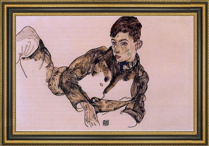 16" x 24" Egon Schiele Reclining Boy Leaning on His Elbow framed premium canvas print reproduced to meet museum quality standards. Our Museum quality canvas prints are produced using high-precision print technology for a more accurate reproduction printed on high quality canvas with fade-resistant, archival inks. Our progressive business model allows us to offer works of art to you at the best wholesale pricing, significantly less than art gallery prices, affordable to all. This artwork is hand stretched onto wooden stretcher bars, then mounted into our 3 3/4" wide gold finish frame with black panel by one of our expert framers. Our framed canvas print comes with hardware, ready to hang on your wall. We present a comprehensive collection of exceptional canvas art reproductions by Egon Schiele.