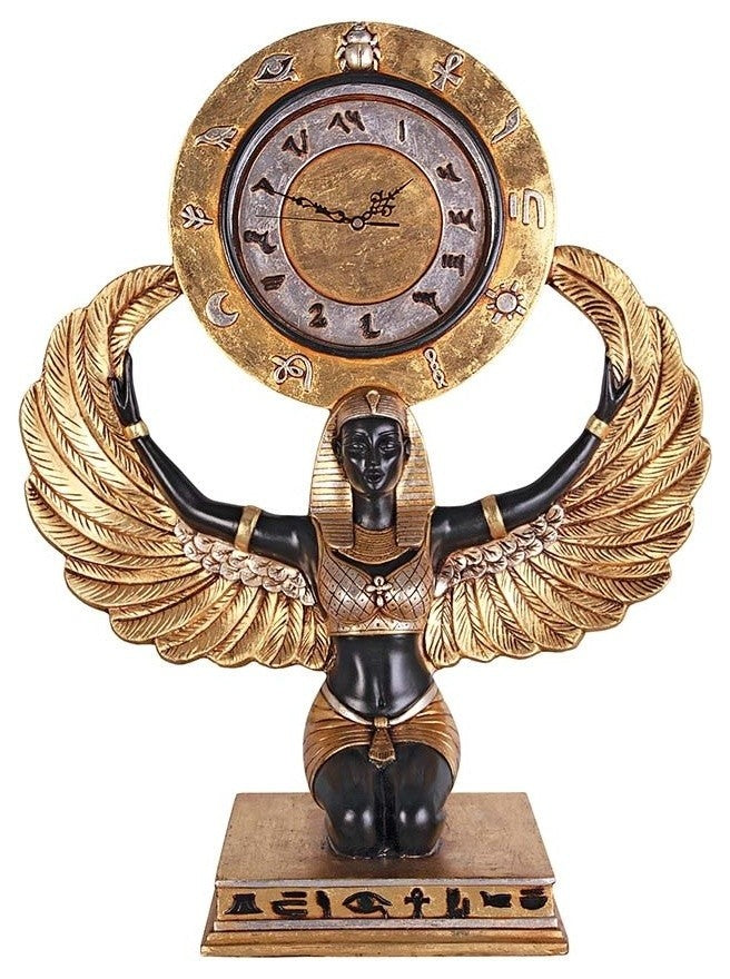 With her wings spread wide, the goddess Isis lifts high a hieroglyph-embellished clock in this Egyptian-style sculpture. Fully functional as well as breathtaking in detail, this statue is cast in high-quality, fiberglass-reinforced resin before being hand-painted in the golden colors of the Egyptian palette. This large-scale, display-quality clock sculpture transforms any home bar, entertainment area or recreation room into something truly magnificent! Requires 1 AA Battery; not included. 22.5"Wx11"Dx28"H. 12 lbs.