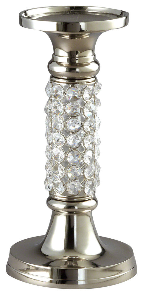 This 10" Sparkle Pillar/Taper Column Candle Holder is crafted from crystals and mirror-finish metal. Together, the materials reflect the light beautifully, creating a romantic, formal aesthetic. A short silver column with a narrow base holds the piece stable, with the base of the top of the piece balancing the metallic look. The crystal is cut into facets that achieve dark and light areas that reflect light more effectively than any other crystal shape. This achieves a brilliant interplay between shades, creating the candle holder??s characteristic sparkle.
