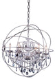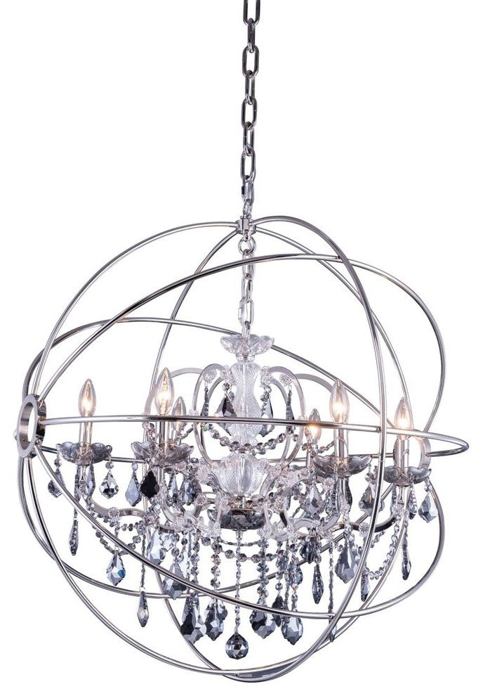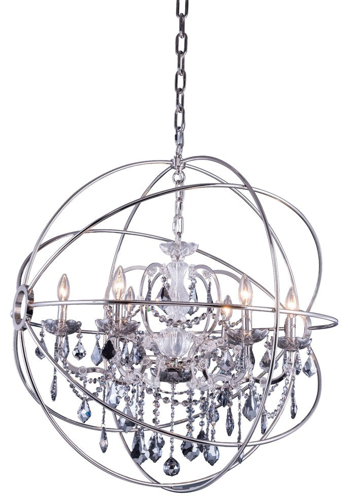 Shades of the past and present merge with new age design to create the Geneva. The old world feel of a classic crystal chandelier suspended in the modern take on the gyroscope. Many finishes and shades of crystal make this a custom classic.Features: • Finish: Polished Nickel • Crystal Color: Silver Shade (Grey) • Style: Transitional • Crystal Trim: Royal Cut • Number of Lights: 6; Recommended Light Bulbs: 6 x E12 Bulb(s) • Includes a 5 ft/ 8 ft chain wireSpecifications: • Overall Product Dimensions: 34.5" H x 32" W x 32" D • Overall Product Weight: 32.68 lbs • Bulb Wattage: 60 • Max Wattage: 360 • Voltage: 110V-125V