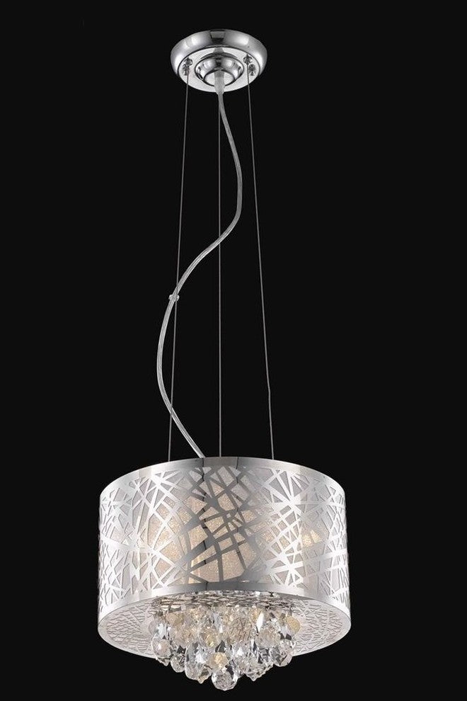 The Prism Collection features a round chrome finish frame with an intricately cut-out metal pattern. Clear crystal ball accents dangle inside the inverted bowl, glistening from this elegant ceiling light. A soft shade rings the inside of the frame to add ambiance to the glow given off from the bulbs tucked inside.
