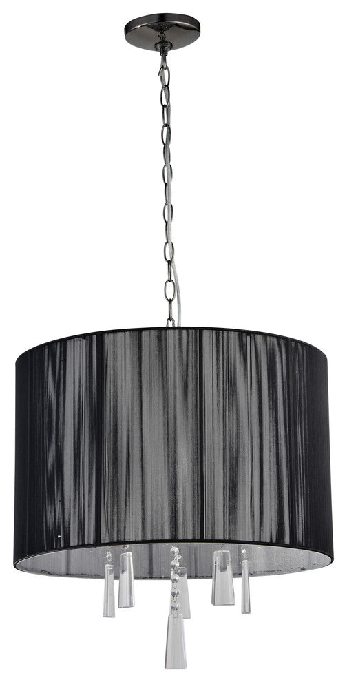 This Elina Modern Black Chrome 5-light Crystal Chandelier/ Pendant with a black threaded silk shade by Artiva USA will make a perfect addition to any room in your home. This elegant, modern design adds a rich, opulent ambiance to any room. The steel frame in a black chrome/ gun metal finish and hanging drops of clear crystal cast a soft, pleasant glow on your decor.