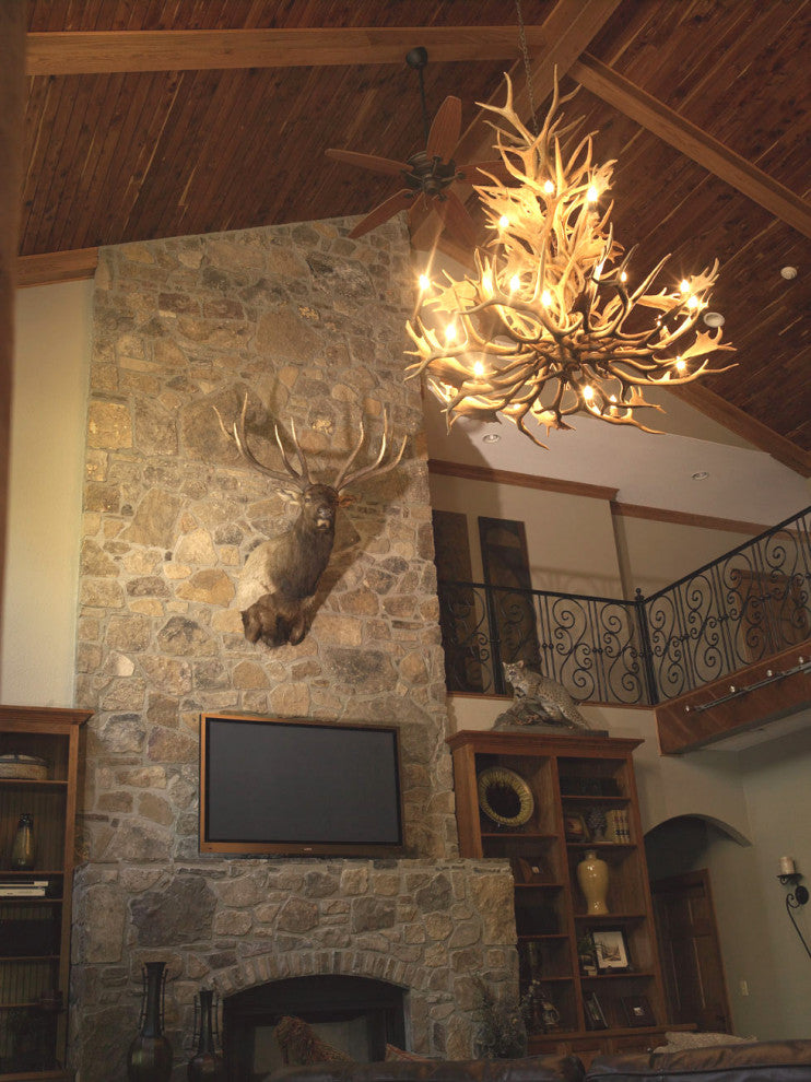 Real Antler Elk / Fallow Cascade Chandelier (54-56"D x 53-58"H), 21 Light Sockets, 6 feet of rustic bronze chain. With Parchment Shades.Handmade in North America using top quality naturally shed real antlers. Sockets are made to resemble real antler, each socket rated up to 60 Watts. Comes balanced and ready to hang. Frosted Bent Tip Candelabra Bulbs included. Certified in U.S & Canada (CSA listed to comply with UL 1598)
