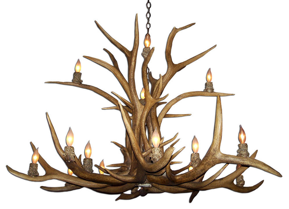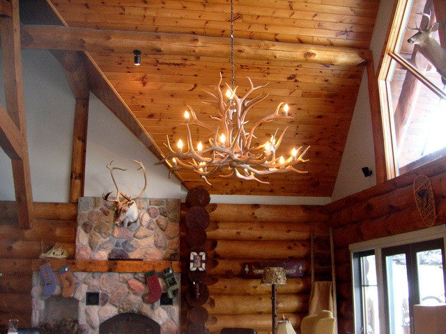 Real Antler Inverted Elk Chandelier (52-55"D x 30-34"H), 15 Light Sockets, 6 feet of rustic bronze chain. With Parchment Shades.Handmade in North America using top quality naturally shed real antlers. Sockets are made to resemble real antler, each socket rated up to 60 Watts. Comes balanced and ready to hang. Frosted Bent Tip Candelabra Bulbs included. Certified in U.S & Canada (CSA listed to comply with UL 1598)