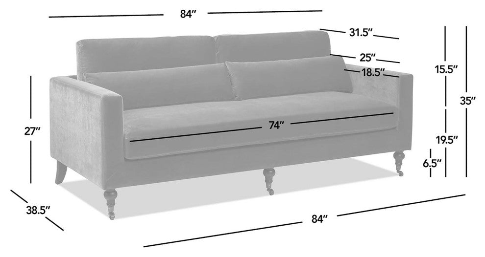 Elevate your living space with the Elliot Sofa Collection by Jennifer Taylor Home. This sofa is a perfect blend of sophistication, style, and luxurious comfort, combining timeless design elements such as a bench cushion seat and caster turn legs with modern functionality with track arms and lumbar pillows - an ideal addition to your home. The lustrous velvet upholstery is performance-grade and easy to clean, ensuring your sofa retains its beauty for years to come. This timeless design fits into a variety of interior styles, from classic transitional to modern.Features:- Track arm sofa design for an ergonomic, comfortable rest for the arms- Spacious bench seat cushion with additional lumbar pillows for a customizable sitting experience- High-density foam with sinuous spring support provides a medium-firm sitting experience- Seat cushion is removable with a removable zippered cover- Back cushions are removable and reversible, with zippered covers- Durable performance velvet upholstery with 30,000+ double rubs- Transitional, Classic, Farmhouse stylesSpecifications:- Dimensions: 84"W X 38.5"D X 35"H- Seat: 74"W X 18.5"D X 19.5"H- Weight: 112 LBS- Weight Capacity: 600 LBS- Number of Shipping Boxes: 1- Minimal assembly required "“ Leg attachment only- Care Instructions: Cleaning Code S: Spot clean with a non-water-based solvent