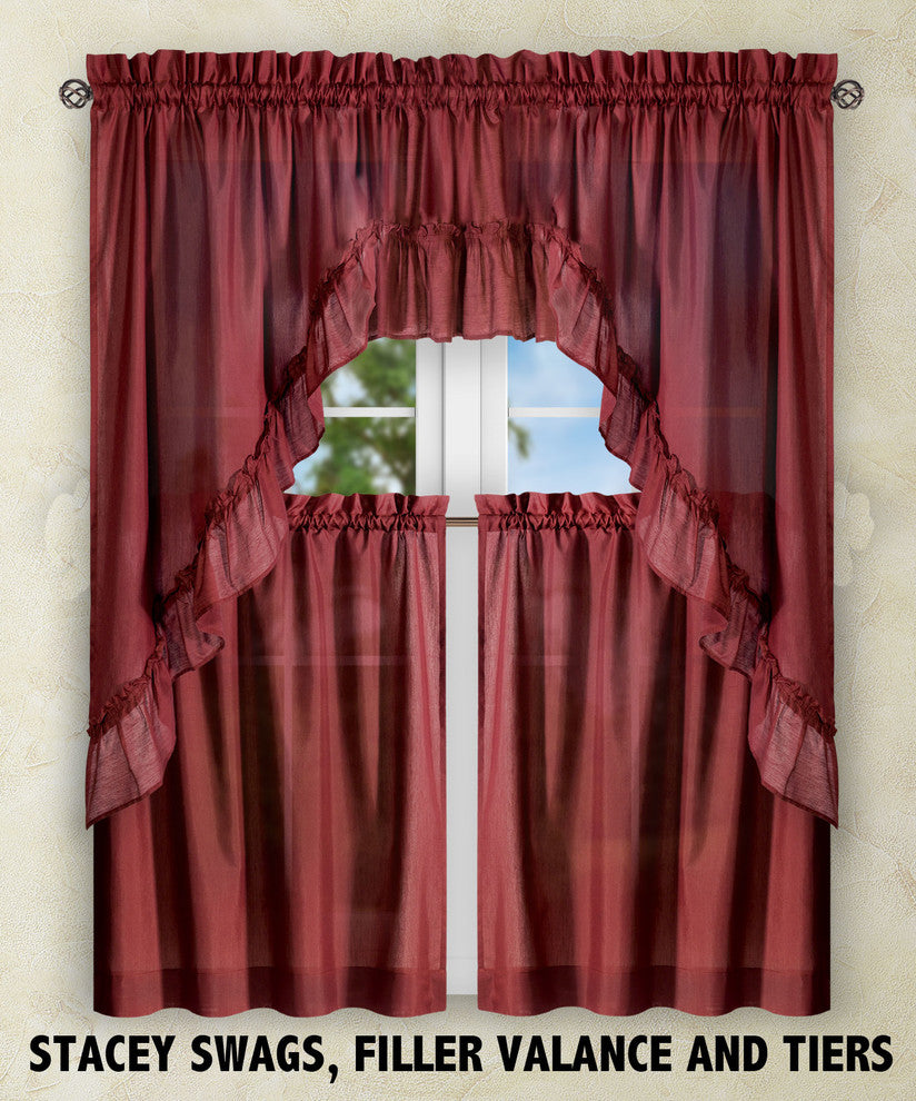 Ellis Curtain Stacey Tailored Tier Pair Curtains"”Bring beauty and a brand new look into your home décor with the Stacey Curtain Program. The popular solid colors coordinate easily with a variety of other solids, checks, plaids, and stripes without over powering them. The Stacey Tailored Tier curtains are engineered form a lighter fabric that is designed to allow some light in while providing privacy. Tailored Tier curtains are used to cover the lower portion of your windows or used alone on shorter length window. Made with 70-percent polyester/30-percent cotton fabric creates a smooth draping effect, soft texture and easy maintenance. Each curtain panel is constructed with a 1.5-inch rod pocket, 1.5-inch header, and 3-inch bottom hem. Sold in pairs (2 Panels) Width is measured overall 56-inches per pair of panels (both 28-inch panels together) Length is measured overall 30-inches from header top (ruffle above the rod pocket) to bottom of panel. For wider windows simply add multiple panels together. Stacey Tailored Tier Curtains can be combined with coordinating Valances and Swags. Machine Washable.