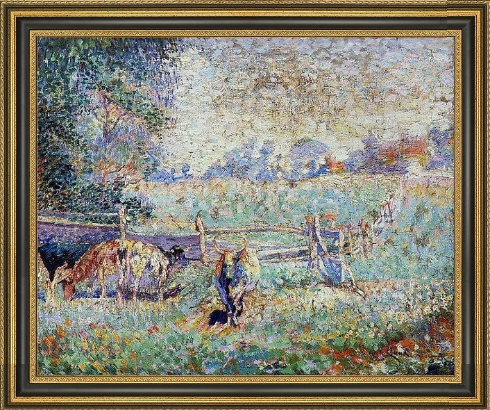 16" x 20" Emile Claus Cows in the Pasture framed premium canvas print reproduced to meet museum quality standards. Our Museum quality canvas prints are produced using high-precision print technology for a more accurate reproduction printed on high quality canvas with fade-resistant, archival inks. Our progressive business model allows us to offer works of art to you at the best wholesale pricing, significantly less than art gallery prices, affordable to all. This artwork is hand stretched onto wooden stretcher bars, then mounted into our 3 3/4" wide gold finish frame with black panel by one of our expert framers. Our framed canvas print comes with hardware, ready to hang on your wall. We present a comprehensive collection of exceptional canvas art reproductions by Emile Claus.