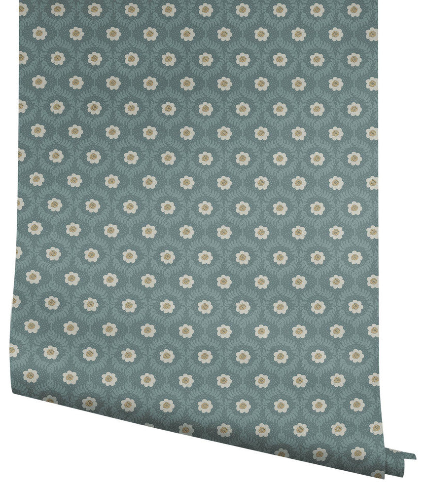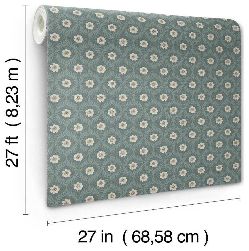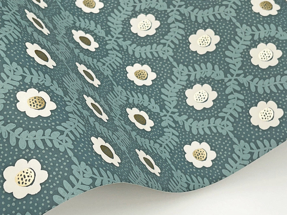 Sweet and playful, this botanical ogee features a central white floral surrounded by a circular, leafy pale teal frame. The slate blue background is given extra depth from tiny, silver dots. This Emma Wallpaper measures approximately 27 inches wide by 27 feet long, measuring approximately 60.8 square feet per roll. The world of Rifle Paper Co. is in full bloom with their third wallpaper collection. With statement floral prints, detailed illustrated designs, and metallic accents, this collection is designed to bring beauty to every room. Unpasted non woven material; 25.25-in repeat, straight match; Washable and strippable; 27-in by 27-ft long roll; Covers about 60.8 square feet