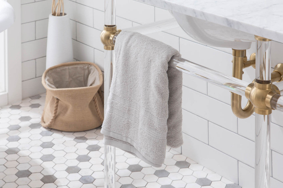 A classically inspired washbasin console, Empire Collection, enhances contemporary beautification into a sophisticated bathroom. Copper joints and acrylic stand melding for a cohesive whole, this Carrara white marble console with crystal clear acrylic stand and smooth white ceramic sink is a perfect match for a miniature bathroom. An accessible bar across the front of deluxe, substantial acrylic legs not only improves stability but also provides a location from which is perfect for hanging towels and toiletries. Suitable for applications both contemporary and traditional, this artful design retains the harmony between proportions and its timeless charisma.