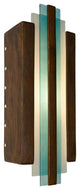 The sleek lines of this Art Deco inspired piece add a touch of modern opulence to any space. This one-of-a-kind wall light integrates fused art glass made from reclaimed window glass and kiln-fired glazed ceramic. The Butternut rectangular ceramic base frames two panes of Turquoise layered art glass and is topped with a ceramic strip at the very center. Light washes the wall through the open top and bottom in addition to circular perforations along the back edge of both sides creating a radiant effect. Subtle color and texture variations are the hallmark of a truly handcrafted piece of art.