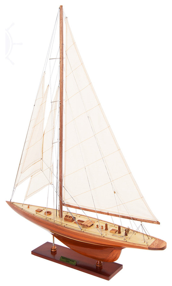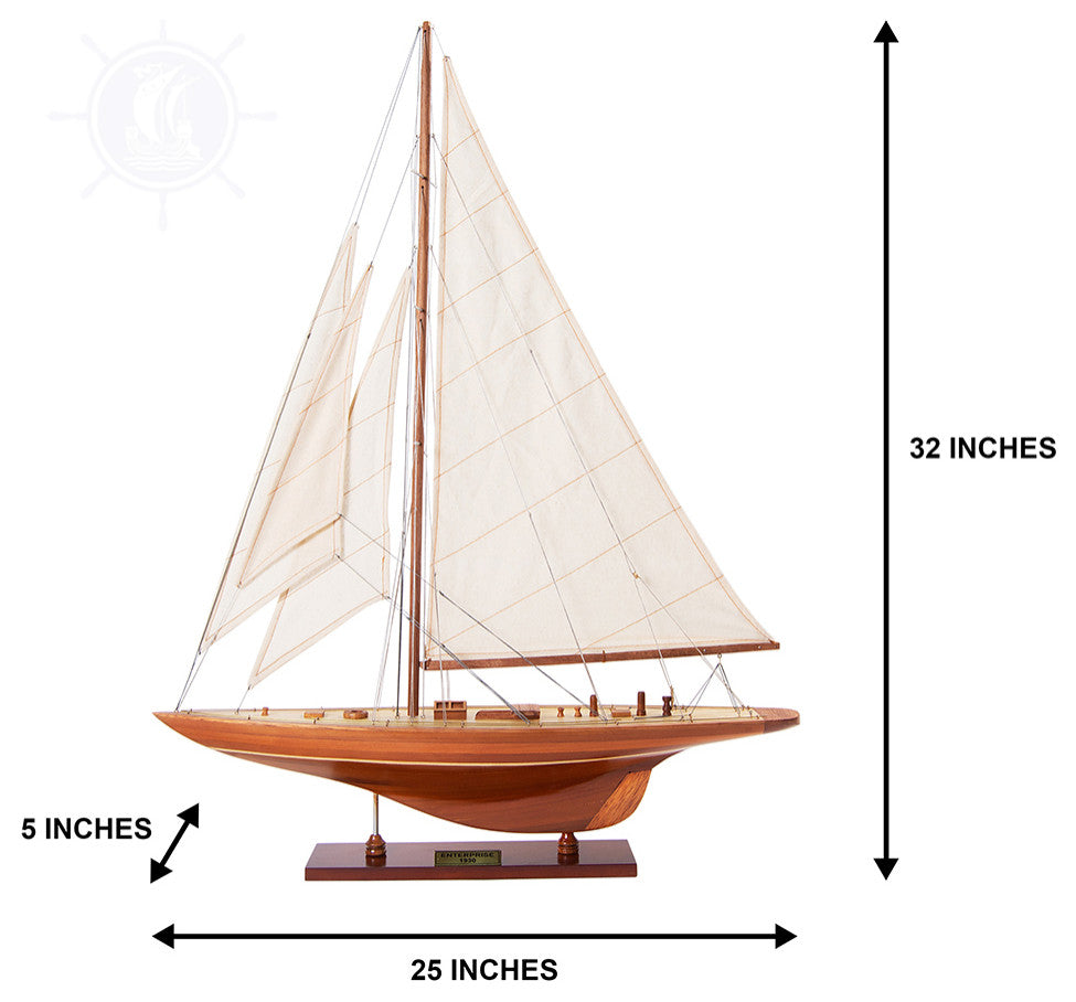 The history of Enterprises SmResponded to Sir Thomas Lipton"™s challenger Shamrock V, four syndicates of Americans commissioned, at great cost, their own contenders. Starling Burgess led the effort for one of the New York syndicates. He promptly engaged the Wizard of Bristol, Nat Herreshoff, dean of American yacht designing, as his adviser. Together, they designed the largest and fastest racing machine ever seen and named her the Enterprise. This great and gorgeous J-boat was eighty feet long at the water line and sported a heavy keel with two centerboards. Her great 162-foot mast tapered from one and one-half feet at the base to nine inches at the top. It was made of two hollow tubes of aluminum and was supported by a large array of stays and rigging. Below deck she had two dozen winches for handling lines. Enterprise made short work of the other three would-be defenders of the Cup and was chosen to take on Shamrock V off Newport, Rhode Island. There, in September 1930, she went on to win a clean sweep of four races, maintaining the 80 year record of uninterrupted possession of Americas Cup.About the Enterprises Sm model ship Our Enterprise Yacht model is scratched built plank on frame by skillful and creative master craftsmen. Strip by strip of mahogany and teak were put together. It was built according to scale through original plans, pictures and drawings. The hull is truly beautiful; It was carefully put together using the best material to create a smooth surface on both sides. On the yacht, you can easily locate gorgeous wooden parts and ornaments such as: wooden mast, wooden boom, wooden bunkers, front and main sails with detailed stitching, wooden pole and metal steering, metal railing, and many more. We only use high quality wood and metal to build the model, absolutely no plastic parts. This beautiful model is rested on a painted solid wooden stand. To enhanced value and recognition, a shiny metal plate embedded withEnterprise 1930is provided. The masts are fold flat down for shipping purpose. Assembly in minutes.