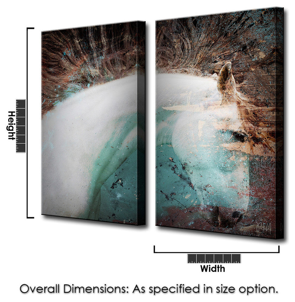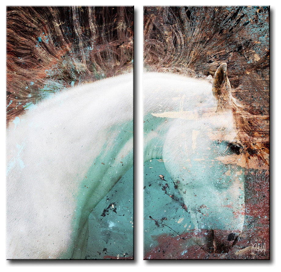 Equestrian Saddle Ink PSII'', a gorgeous white horse on a bed of abstract vibrant colors, is kingly. Power and grace enhances this piece with dramatic movement and subtle contrast. Beautify your space with this uniquely enthused canvas