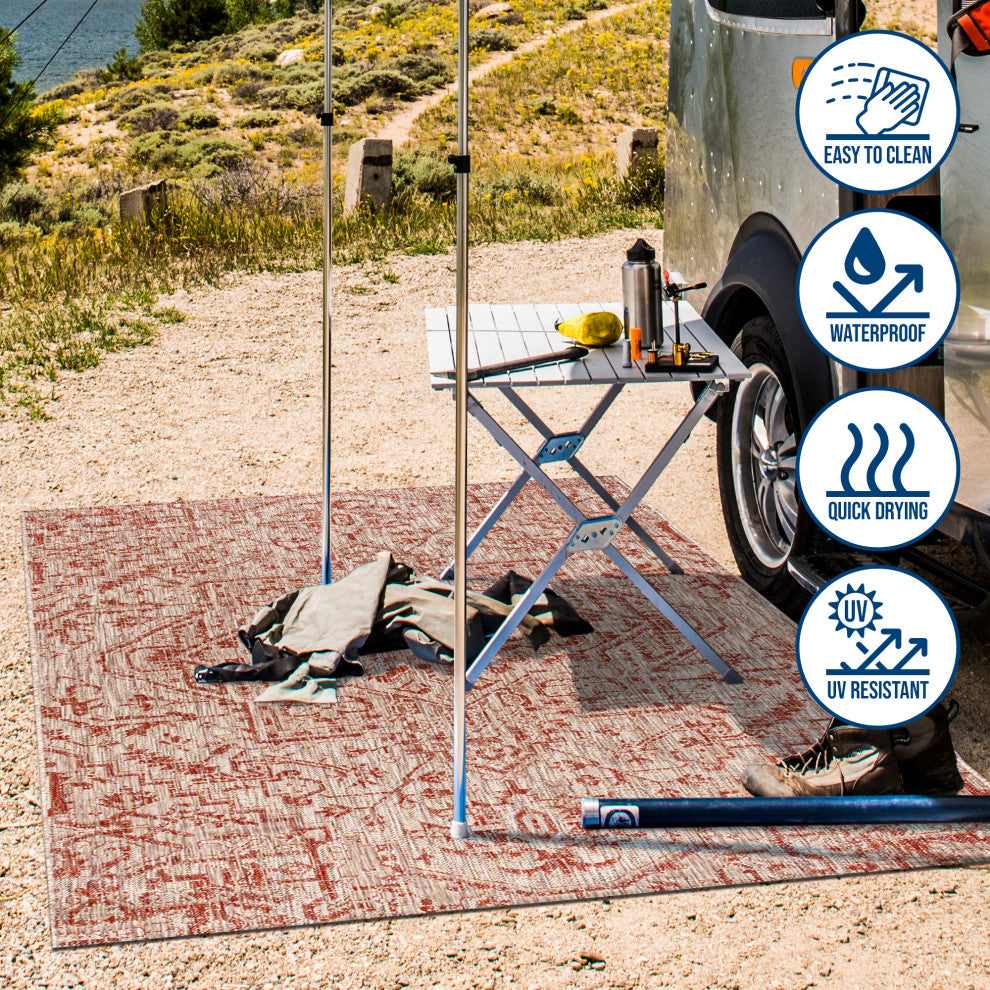 With its star-inspired medallion, this borderless rug adds dreamy Bohemian style to an outdoor porch or patio. Varied tones of red and rust on a mingled gray background give this rug a hand-woven, vintage vibe. The flatweave design is great for high-traffic spaces indoors too.Features:• Flat-weave construction of 100% polypropylene• Red and taupe with a handwoven mingled texture• Water resistance with 0.19" pile• 100% Polypropylene• No backing, use of rug pad is recommended (sold separately)• Power Loomed in Turkiye• Actual Dimension: 9 ft x 9 ft. Round• Color: Red/Taupe• Thickness measures: 0.19 in.• Available in multiple sizes and/or colorsRug Care:• Vacuum regularly and spot clean as needed; avoid direct and continuous exposure to sunlight; use brushless vacuum; remove spills immediately; if liquid, blot with clean, undyed cloth by pressing firmly around the spill to absorb as much as possible; for hard to remove stains, professional rug cleaning is recommended; store in a dry, well ventilated area and rotate for consistent wear• Packing and shipping may cause temporary creases in rugs, which will flatten out after a week on the floor; to expedite the process, try back-rolling your rug before laying it down, and then allow ample time for the remaining creases to relax• Please Note: Due to differences in monitors, some rug colors may vary slightly. Lengths and widths may vary from the published dimensions. Patterns may vary slightly according to shape and size selected.About us:Style your floors with JONATHAN Y. By combining fine craftsmanship and design, this New York creative studio is bringing fashion to your floors. The collection mixes sustainable organic materials, vibrant colors and trend worthy styles to create JONATHAN Y''s distinctive catalog of rugs.