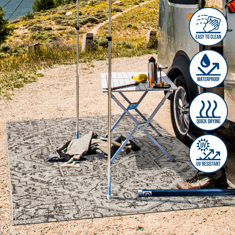 With its star-inspired medallion, this borderless rug adds dreamy Bohemian style to an outdoor porch or patio. Varied tones of black on a mingled gray background give this rug a hand-woven, vintage vibe. The flatweave design is great for high-traffic spaces indoors too.Features:• Flat-weave construction of 100% polypropylene• Black and gray with a handwoven mingled texture• Water resistance with 0.19" pile• 100% Polypropylene• No backing, use of rug pad is recommended (sold separately)• Power Loomed in Turkiye• Actual Dimension: 9 ft x 9 ft. Round• Color: Black/Gray• Thickness measures: 0.19 in.• Available in multiple sizes and/or colorsRug Care:• Vacuum regularly and spot clean as needed; avoid direct and continuous exposure to sunlight; use brushless vacuum; remove spills immediately; if liquid, blot with clean, undyed cloth by pressing firmly around the spill to absorb as much as possible; for hard to remove stains, professional rug cleaning is recommended; store in a dry, well ventilated area and rotate for consistent wear• Packing and shipping may cause temporary creases in rugs, which will flatten out after a week on the floor; to expedite the process, try back-rolling your rug before laying it down, and then allow ample time for the remaining creases to relax• Please Note: Due to differences in monitors, some rug colors may vary slightly. Lengths and widths may vary from the published dimensions. Patterns may vary slightly according to shape and size selected.About us:Style your floors with JONATHAN Y. By combining fine craftsmanship and design, this New York creative studio is bringing fashion to your floors. The collection mixes sustainable organic materials, vibrant colors and trend worthy styles to create JONATHAN Y''s distinctive catalog of rugs.