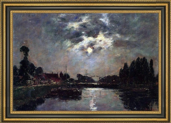 16" x 24" Eugene-Louis Boudin Saint-Valery-sur-Somme Moonrise over the Canal framed premium canvas print reproduced to meet museum quality standards. Our Museum quality canvas prints are produced using high-precision print technology for a more accurate reproduction printed on high quality canvas with fade-resistant, archival inks. Our progressive business model allows us to offer works of art to you at the best wholesale pricing, significantly less than art gallery prices, affordable to all. This artwork is hand stretched onto wooden stretcher bars, then mounted into our 3 3/4" wide gold finish frame with black panel by one of our expert framers. Our framed canvas print comes with hardware, ready to hang on your wall. We present a comprehensive collection of exceptional canvas art reproductions by Eugene-Louis Boudin.