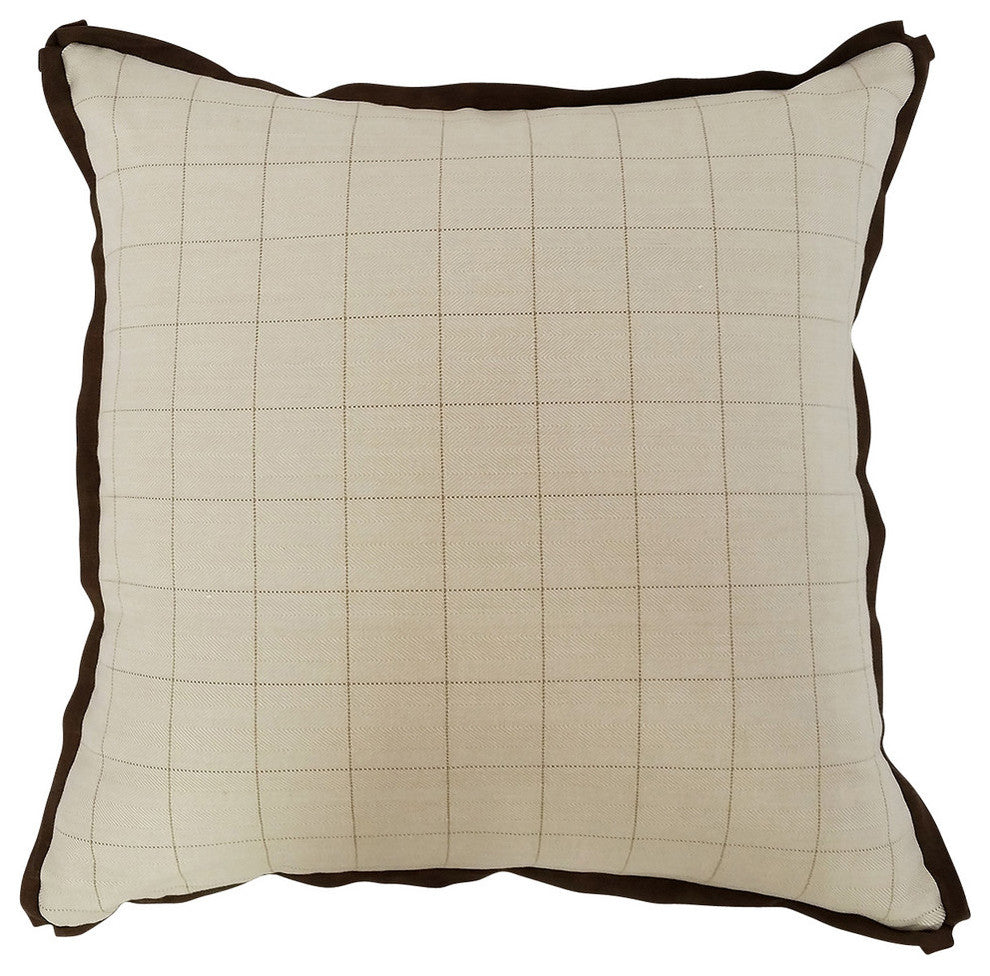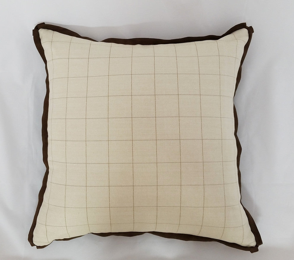 The Devonshire Euro pillow is a soft cotton plaid backed in a chocolate linen with a 1/2" flat pipe on all 4 sides, with hidden zipper and filled with featherdown.