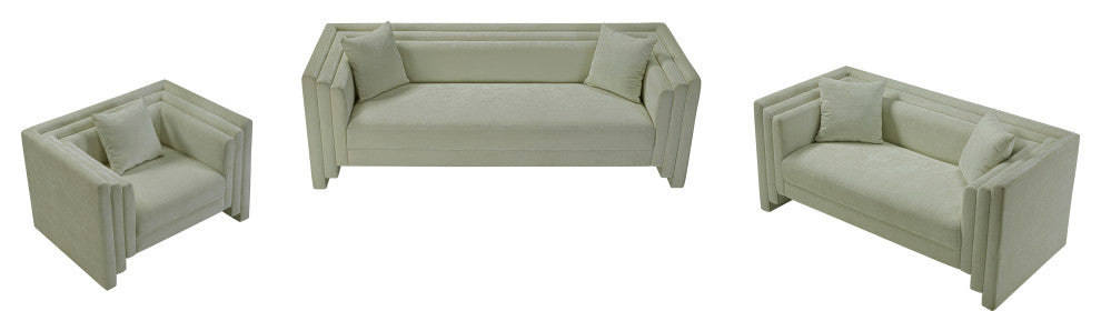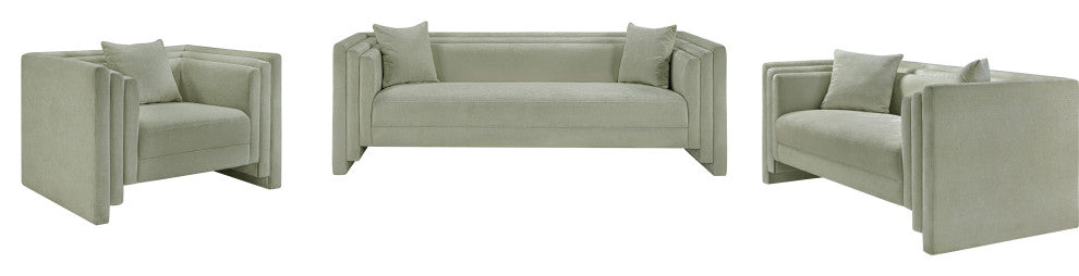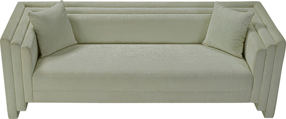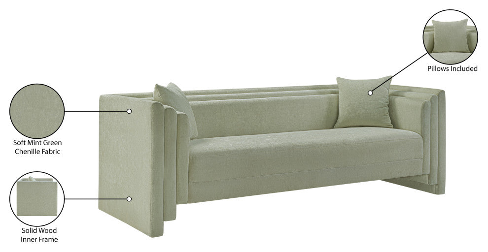Make this Everett mint chenille fabric sofa the center of a cozy reading nook. Handsome from every angle, this posh sofa is plumply appointed to put supreme comfort within easy reach. Soft mint chenille upholstery fabric adds to its lavish feel while a staggered design gives it a modern edge. An included pillow gives it a beckoning vibe while the sofa''s solid wood inner frame makes it a lasting addition in any room.Overall Product Dimensions: 88.5" W x 34" D x 29" HSoft Mint Green Chenille FabricSolid Wood Inner FramePillows IncludedContemporary DesignSeat Dimensions: 69.5" W x 24" D x 19" HArm Height: 30"Back Height: 30"