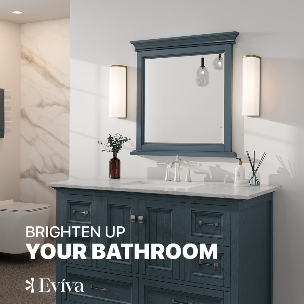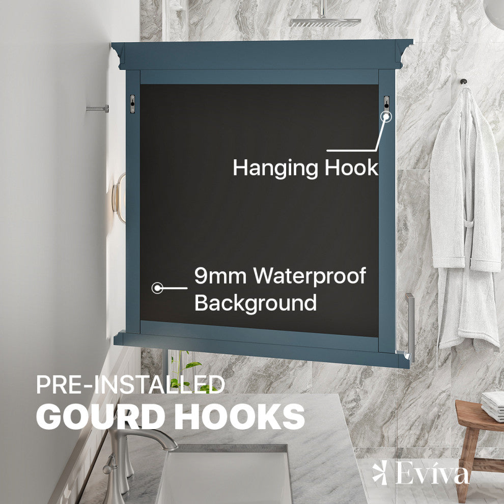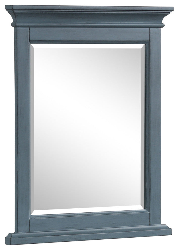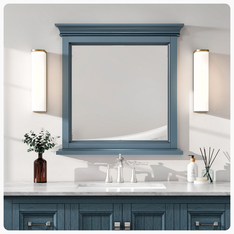 The Eviva Britney Mirror adds a touch of transitional elegance to your home or bathroom. Its sturdy wood frame and featuring a Decorative 5.5" wooden crown framed molding in Ash Blue finish, with waterproof premium material ensures durability and a classic sophisticated look. The mirror features burst proof glass with beveled edges and crystal clear reflection and minimal distortion, with 9mm waterproof back and allows for both horizontal and vertical mounting options. The Britney Mirror is available in 24" width and a height of 30", and includes all necessary mounting hardware and brackets for easy installation.Sturdy rectangular wooden frame with a stylish Ash Blue finish and 2.25" thicknessPremium quality mirror glass with beveled edges and 9mm waterproof backDecorative wooden crown framed mirror design for a classic sophisticated lookCrystal clear reflection with minimal distortionOffers both horizontal and vertical mounting optionsIncludes all necessary mounting brackets and hardware for easy installation