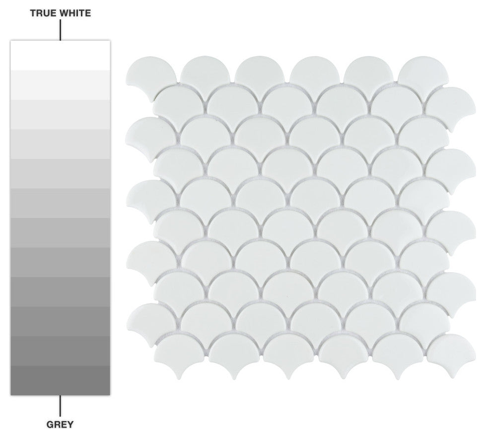 Our Expressions Scallop White Glass Mosaic Tile is made of recycled pressed glass. The white fish scale shaped pieces feature a stunning mixed finish for added dimension. With characteristics of unglazed porcelain tile, this mosaic is impervious and frost resistant. These mesh-mounted tiles offer a high durability rating that is great for any interior or exterior space. Tile is the better choice for your space. This tile is made from natural ingredients, making it a healthy choice as it is free from allergens, VOCs, formaldehyde and PVC.