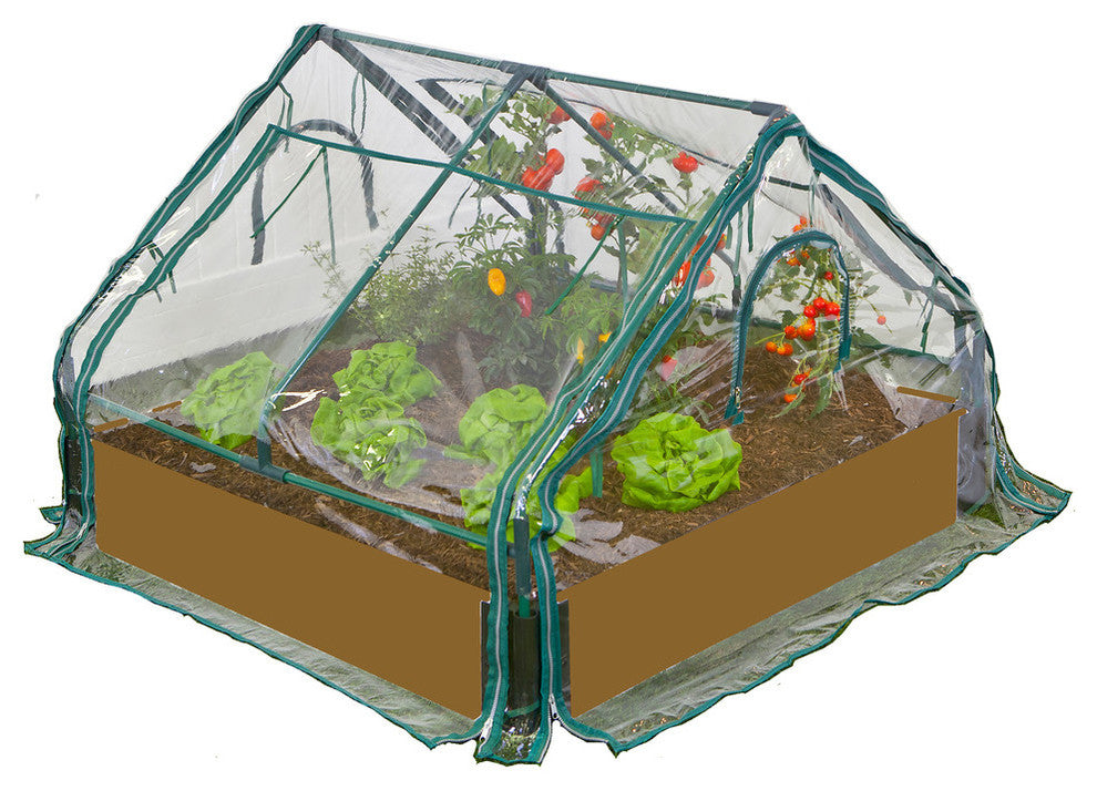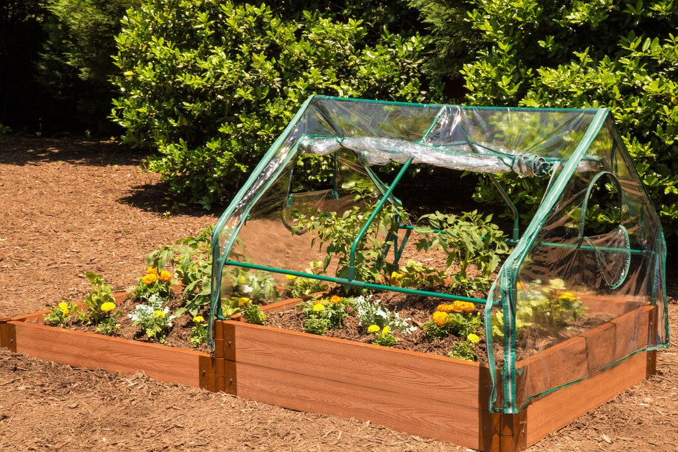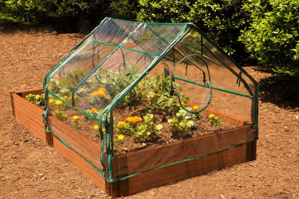 The Frame It All Extendable Cold Frame Greenhouse measures 4ft. x 4ft. and stands 36in. high at its peak. Multiple units can be zippered together end-to-end, to create a continuous row of coverage. The zippered windows allow easy access for tending to your plants, and controlling temperature and humidity. The powder-coated steel frame will not rust or corrode, and the heavy-duty PVC cover will stand up to heavy wind or inclement weather. Connects directly to any Frame It All raised garden bed. When used in conjunction with Frame It All Raised Beds you can increase your soil temperature even further. Our open-channel raised garden bed boards insulate the soil against temperature loss (protecting the roots), while the cold-frame helps control the ambient temperature around the plants (protecting foliage).