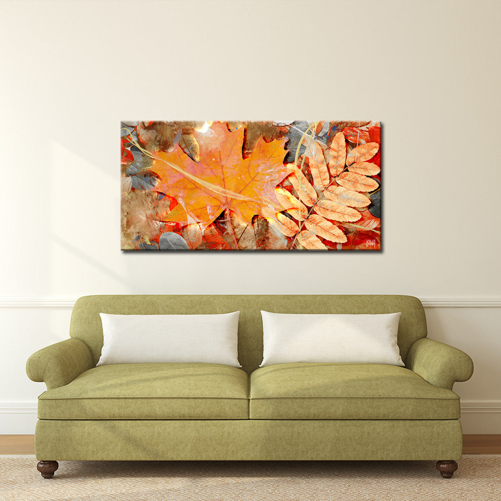 Bring the opulent energy of a commencing autumn into your contemporary space with this shimmering, leaf abstract. A metallic duo of a convex and whorled shaped leaves lay upon a bed of crisp foliage, glistening from the fiery sun looming above, as fall is just arriving. Handcrafted in the U.S.A., this gallery wrapped canvas art arrives ready to hang on your wall. Refine your space with an art piece from Ready2HangArt''s Fall Ink collection, which will effortlessly bring a warm essence of autumn to any style of decor.