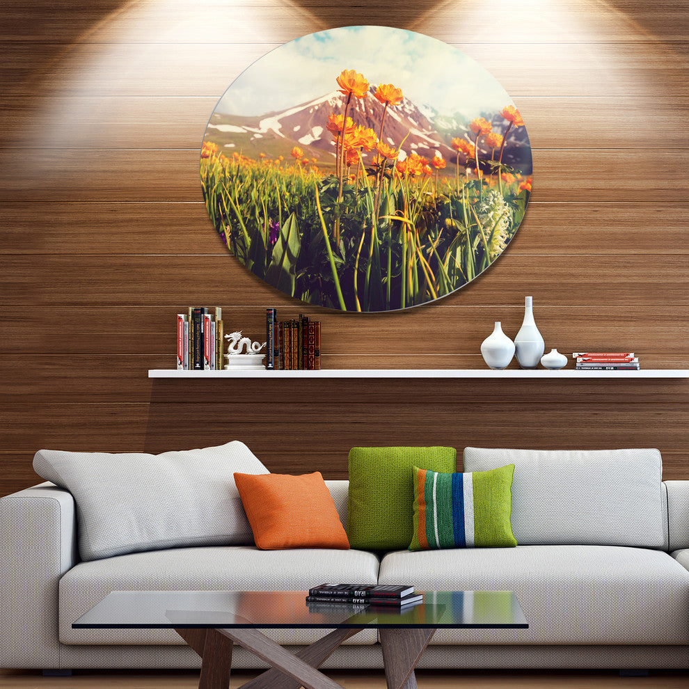 Bring Contemporary Abstraction to your home with this large Circle Metal wall art. This Fantastic Yellow Flowers in Meadow Metal Artwork makes it the focal point of any room or office.