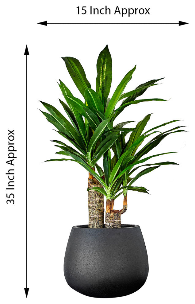 Our faux dracaena plant is reproduced expertly, it could be mistaken for a real one. Whether you use it to decorate your living room or office or a retail store, this artificial plant is sure to leave a bold statement in any space. It features two staggered mature trunks with the long leaves of this plant sprouting from four new stems. This comes in a small black pot which can easily be dropped in a planter that matches your style and decor. Works well for a hotel or building lobby or even in a smaller planter for a table top display. Sold individually, it measures 35" Tall and 15" Diameter. Please note, this faux Dracaena will arrive with nearly flat leaves. Shape and bend them to create your desired shape. As with all products made by Serene Spaces Living, you can be assured of quality and design for this fake plant as well!