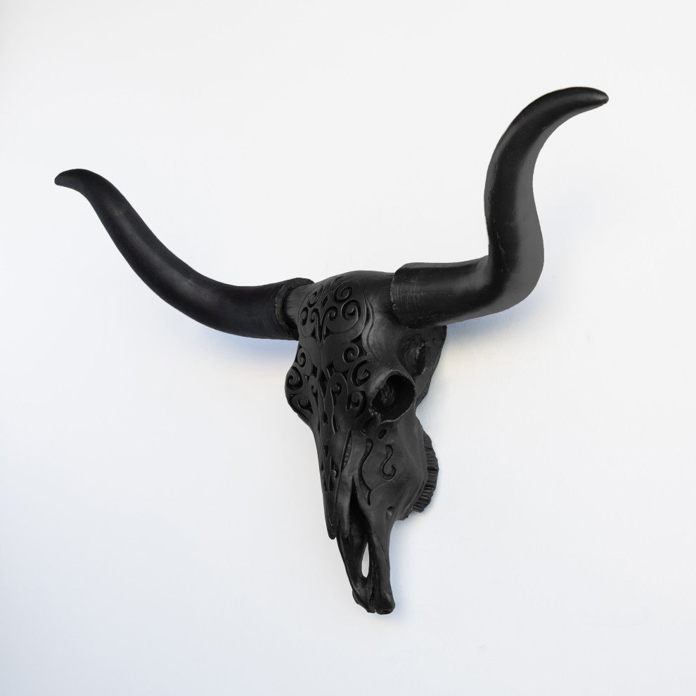 Faux Large Carved Texas Longhorn Skull Wall Decor, Matte Black